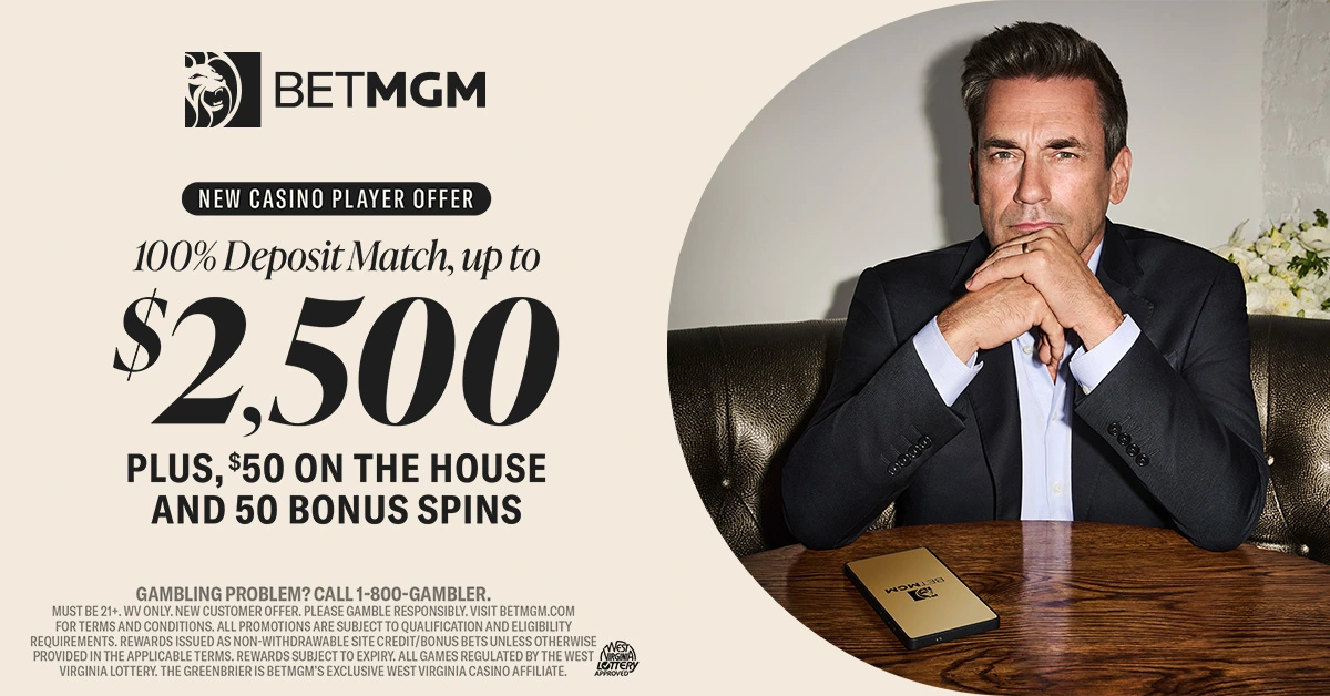 Please Gamble Responsibly. Visit BetMGM.com for Terms and Conditions. All promotions are subject to qualification and eligibility requirements. Rewards issued as non-withdrawable site credit/Bonus Bets unless otherwise provided in the applicable terms. Min. first deposit of $10 for Deposit Match and Bonus Spins. Must claim Bonus Spins through Casino Promotions Section after deposit. Bonus Spins winnings credited as Casino Bonus. 1x wagering requirement applies on Casino Bonus. All games regulated by the West Virginia Lottery. The Greenbrier is BetMGM’s exclusive West Virginia casino affiliate